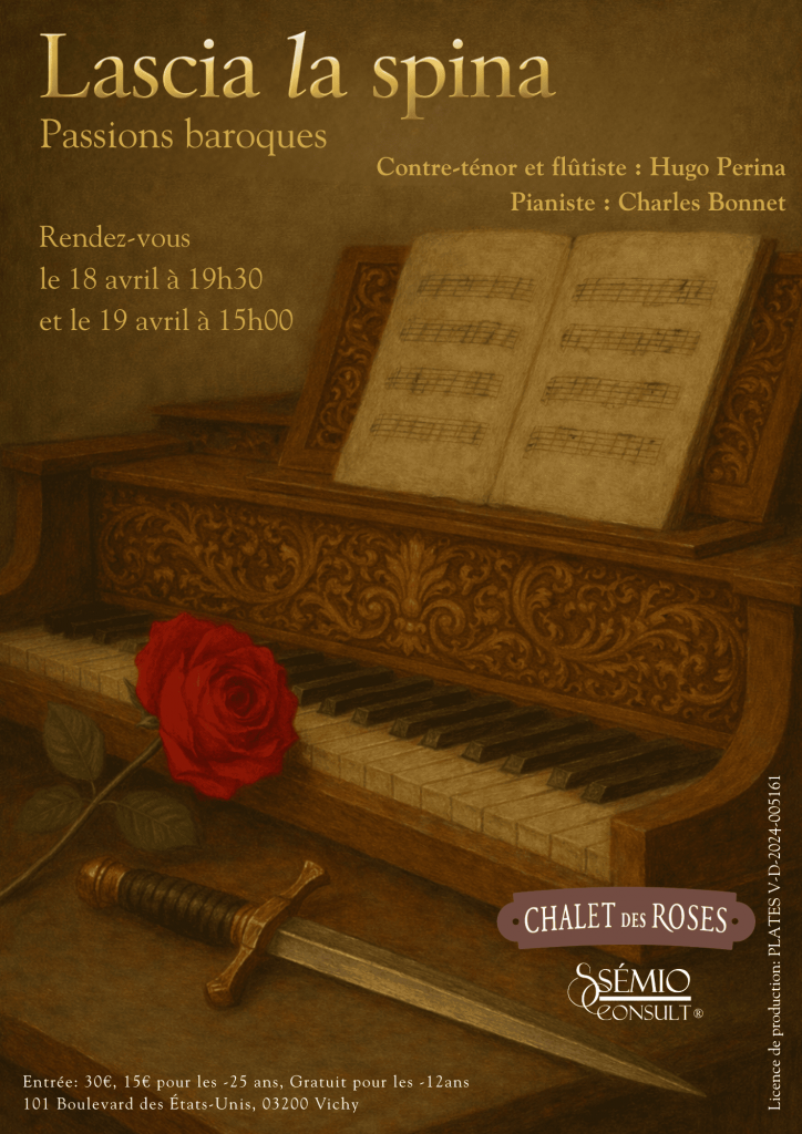 Dans l’écrin intimiste du Chalet des Roses, monument historique privé de Vichy, « Lascia la spina » célèbre l’amour et les fleurs à travers la musique baroque. De Giulio Caccini à Claudio Monteverdi, de Antonio Vivaldi à Georg Friedrich Haendel, la voix du contre-ténor et la flûte traversière d’Hugo Perrina, portées par le piano de Charles Bonnet, composent un jardin sonore fait de soupirs, de blessures offertes comme des fleurs et de douceurs suspendues.